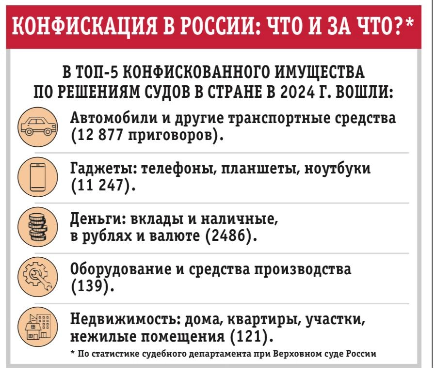За пьяную езду виновных лишают машин. Но, по словам юриста, за другие преступления УК предусматривает широкий перечень имущества, которое могут конфисковать, — деньги, материальные ценности, компьютеры, планшеты и телефоны. «Был в РФ случай, когда конфисковали автомобиль уже у умершего к тому момента гражданина. Дело дошло до Конституционного суда, и тот постановил: так делать можно. Так что в нашей стране даже смерть не является уважительной причиной, чтобы автомобиль не конфисковали», — отмечает Кирилл Стецко.