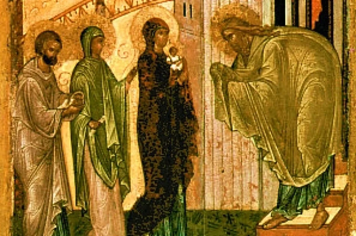 Согласно Евангелию от Луки, через 40 дней после Рождества Христова Мария и Иосиф принесли младенца Иисуса в храм, чтобы выполнить закон Моисея — принести жертву и освятить первенца. Это место и дало название празднику — Сретение (от старославянского «сретение» — «встреча»).