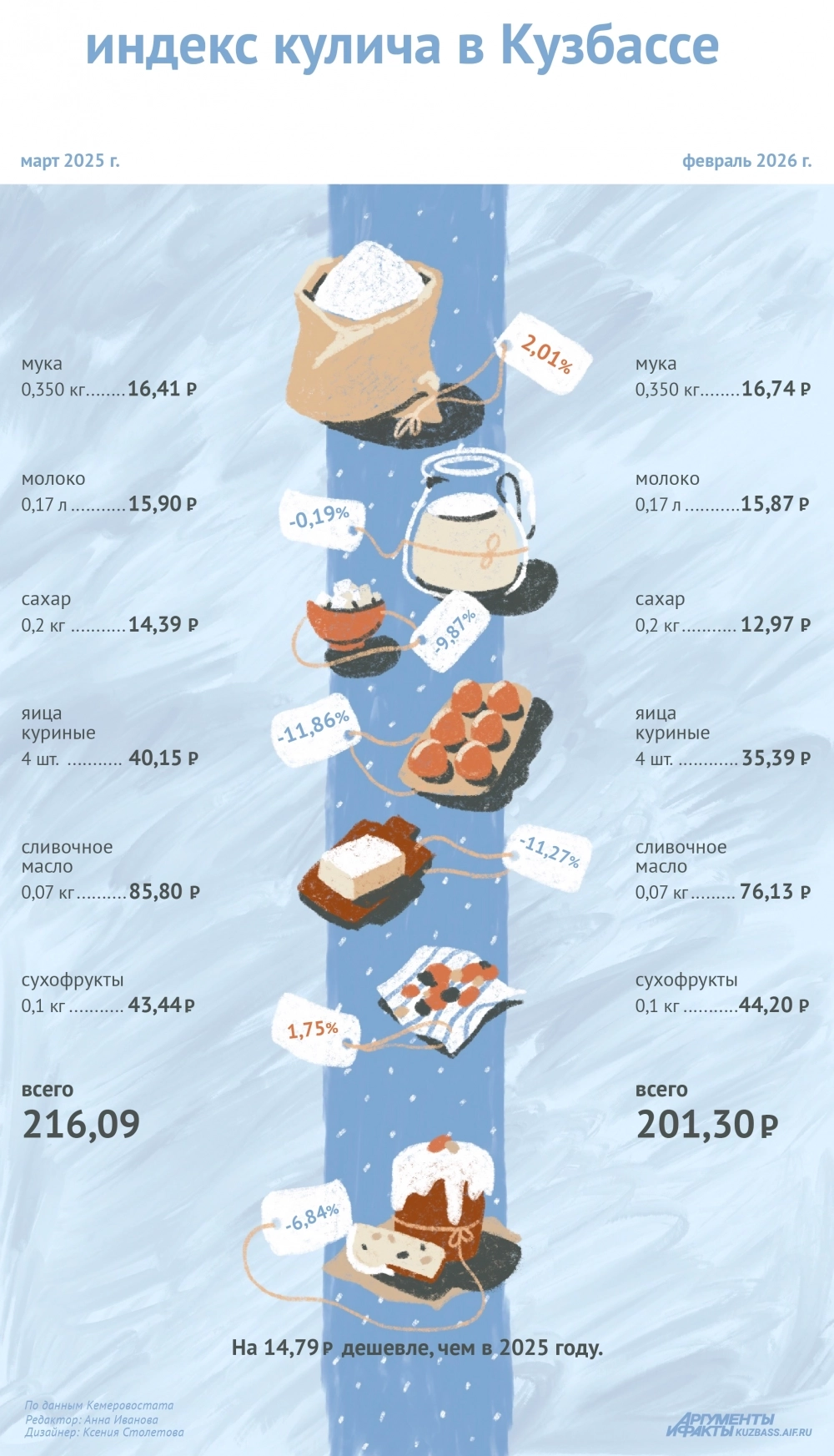 Ниже стала цена на молоко, сахар, куриные яйца и сливочное масло, однако подорожала мука и сухофрукты. Мы исходили из стоимости продуктов, указанной в Кемеровостате. Подробнее смотрите в инфографике.