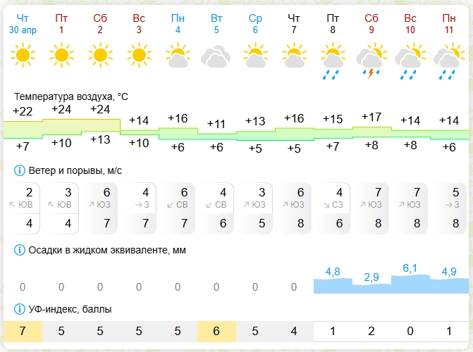 Так, 1 мая будет одним из самых тёплых дней, когда обещают +24 градуса. А вот на День Победы в Кемерове может пойти дождь с грозой и похолодать до +17 градусов.