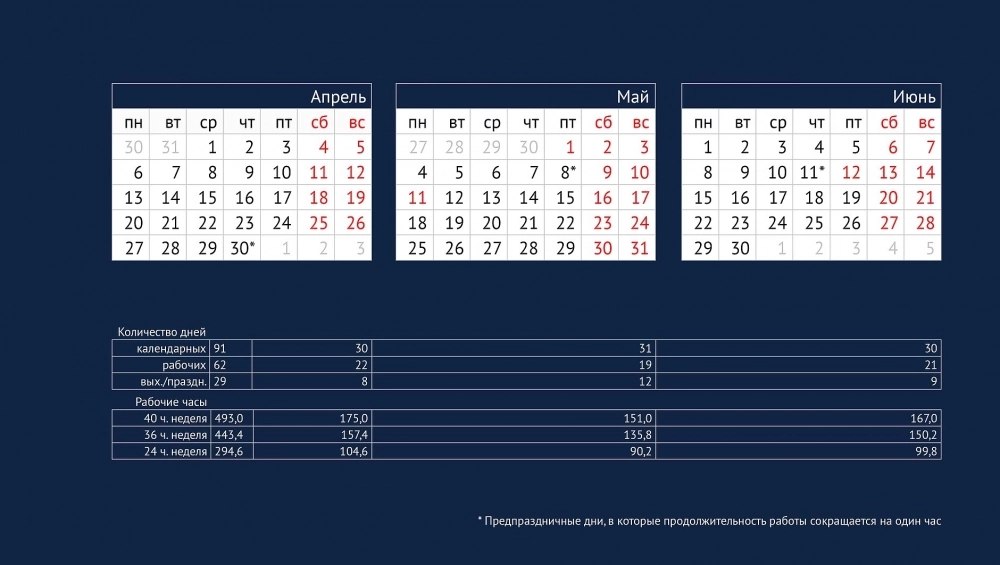 В мае 2026 года работники будут отдыхать с 1 по 3 мая в связи с празднованием Праздника Весны и Труда, а также с 9 по 11 мая в связи с празднованием Дня Победы. В июне период отдыха в связи с празднованием Дня России продлится с 12 по 14 июня, а в ноябре в связи с празднованием Дня народного единства — 4 ноября 2026 года. Также днём отдыха будет 31 декабря 2026 года.