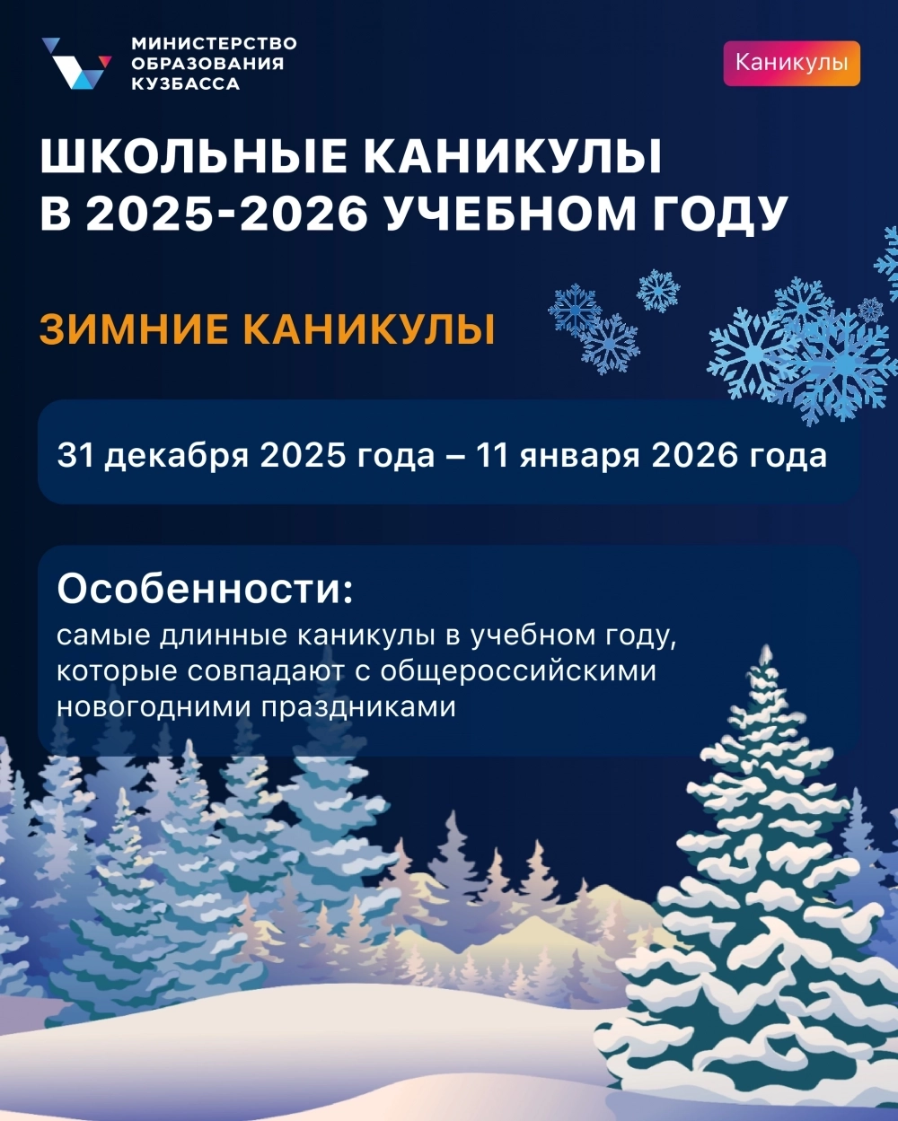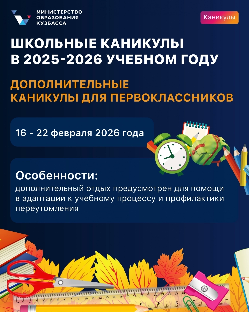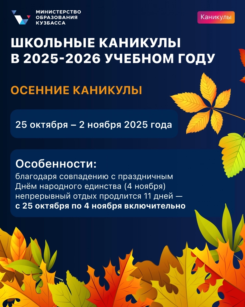 Когда у школьников осенние каникулы 2025/2026 в Кузбассе?