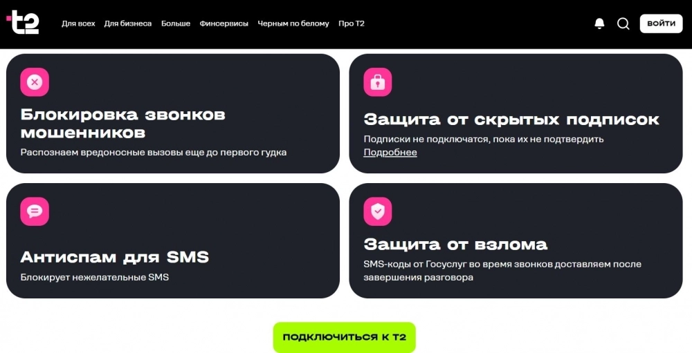 Платформа SafeWall построена по многоуровневому принципу. Базовый уровень доступен всем абонентам бесплатно и включен в любой тариф, при этом надежно защищает клиентов от киберугроз. Расширенные функции можно подключить по мере необходимости. Уже сейчас каждый пользователь Т2 получает комплексную базовую защиту от самых актуальных цифровых угроз без дополнительных настроек и платы.