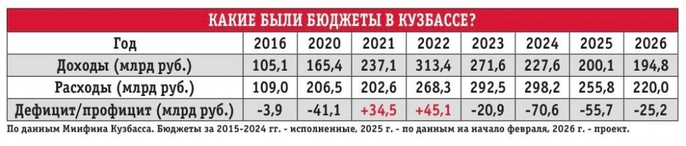 Областной бюджет кузбасские депутаты приняли ещё в декабре. Министр финансов Игорь Малахов с грустью констатировал: «Сегодня мы переживаем не лучшие времена... Второй год подряд бюджет на ближайшую трёхлетку мы формируем в условиях беспрецедентного снижения собственных доходов региональной казны. Поэтому приходится сокращать значительную часть расходов. Их оптимизация ведётся постоянно».