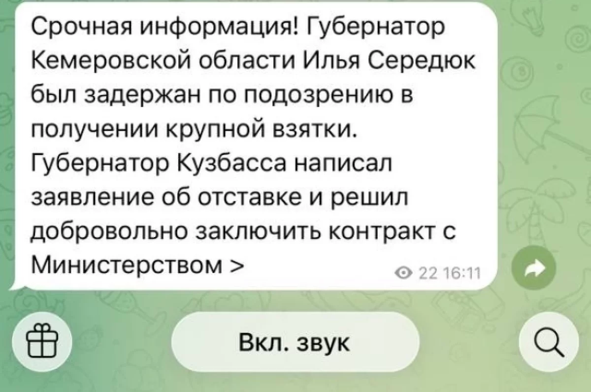В фейковом сообщении от лица якобы пресс-службы регионального правительства сообщалось, что губернатор Илья Середюк был задержан по подозрению в получении взятки и написал заявление об отставке.