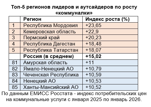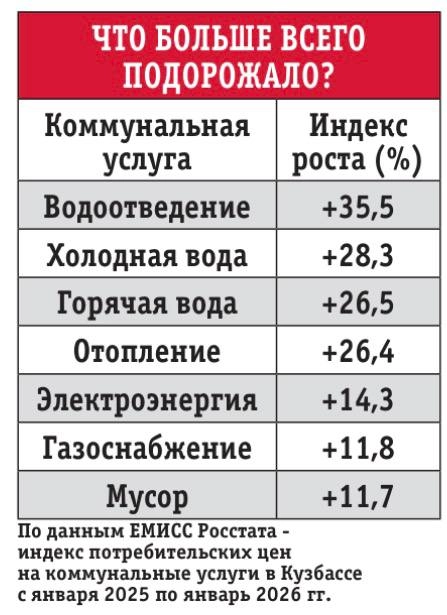 По данным Росстата, в январе 2026 года цены на коммунальные услуги в Кемеровской области выросли на 22,9% — это данные по сравнению с январём 2025-го. Показатель — один из самых высоких в стране. Больше нас стали платить только жители Мордовии — на 23,7%. В топ-5 по России также попали Пермский край, Дагестан и Татарстан. Меньше всего «коммуналка» подорожала в Ханты-Мансийском, Ненецком автономных округах и в Чечне — менее чем на 11%. А средний показатель по России составил 15%.