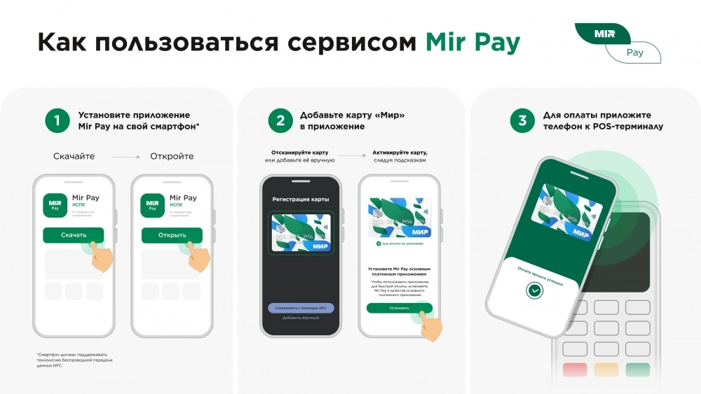 Чтобы воспользоваться предложением при оплате поезда, нужно заранее загрузить банковскую карту в один из мобильных платёжных сервисов, например приложение Mir Pay. Платежные сервисы доступны только на операционной системе Android.