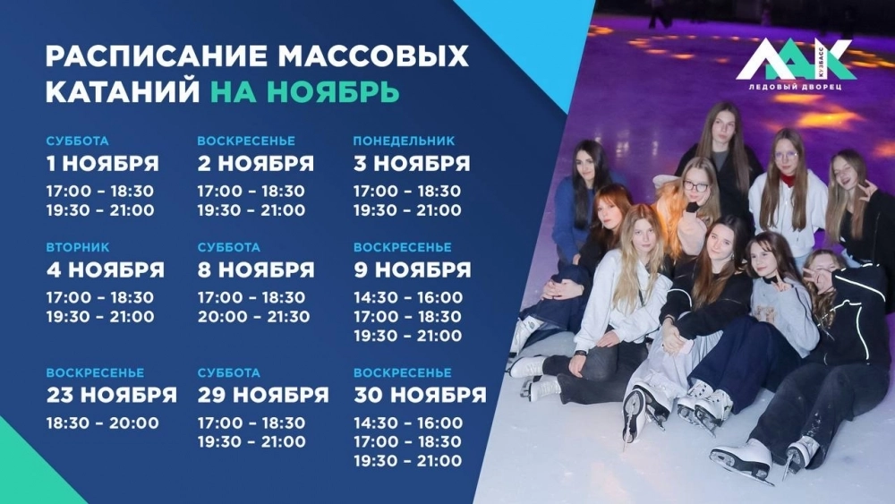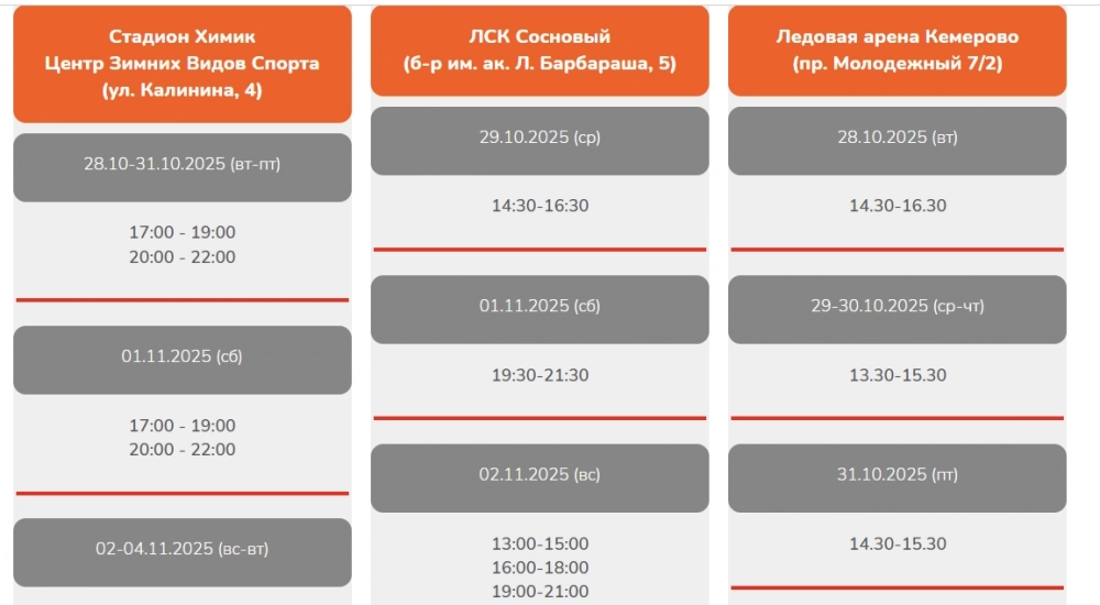 Многие спортивные объекты в Кемерове уже опубликовали расписание массовых катаний на льду на ноябрь 2025. kuzbass.aif.ru рассказывает, где и когда можно покататься на коньках. Вход на крытые стадионы платный, стоимость нужно уточнять отдельно в перечисленных нами ЛДК «Кузбасс», стадионе «Химик», ЛД «Металлист», ЛСК «Сосновый» и в Ледовой арене Кемерово.